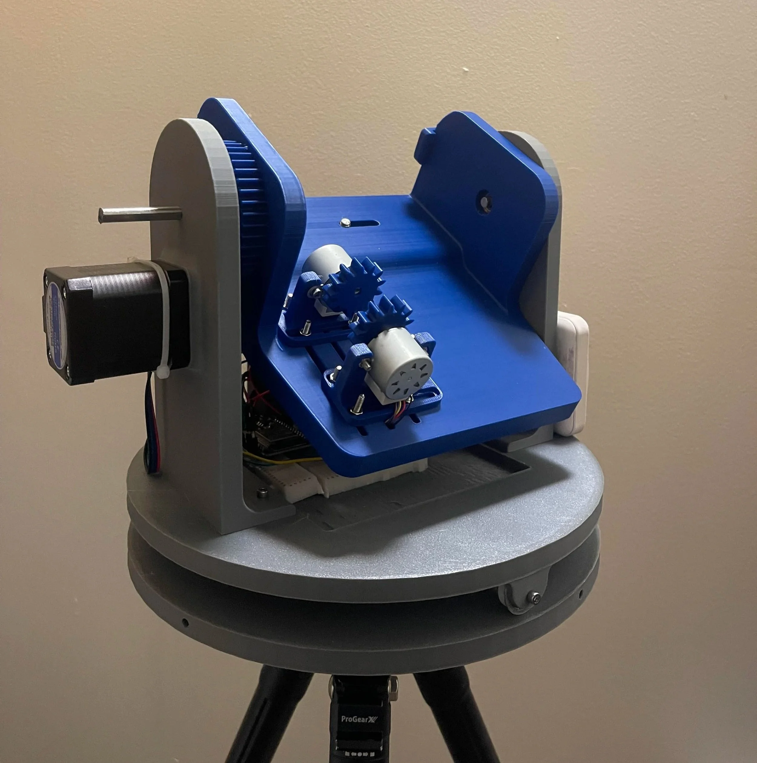 Bringing my passions for photography and engineering together, I designed and built a 2-axis universal DSLR time-lapse gimbal equipped with motorized focus and zoom. The gimbal uses encoded stepper motors and a custom-designed gear system to enable smooth, precise movement free of motor strain. An onboard battery enables infinite yaw rotation and in-field use. To control the gimbal, I coded a web application that runs locally on the gimbal's microcontroller and can be used on any Wi-Fi device. The software also allows time-lapse sequences to be programmed.